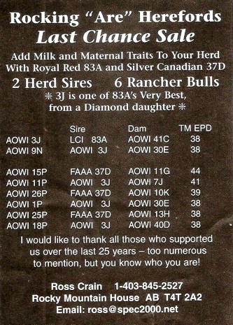 From 1979 to 2005, we raised purebred Hereford bulls and replacement females for commercial ranchers and other purebred breeders. We were told that our stock was "one of the best kept secrets in the Hereford industry". Our bulls were Maternal Trait Leaders and 10% of our cows showed up on the Top Producing Female list most years.