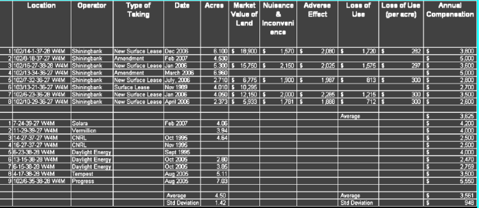 To find some compensation awards by the various provincial Surface Rights Boards, Google "Surface Rights" "Compensation" "Comparables", and see what you get.