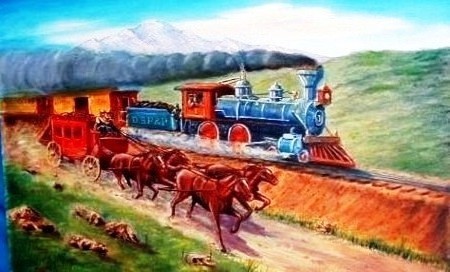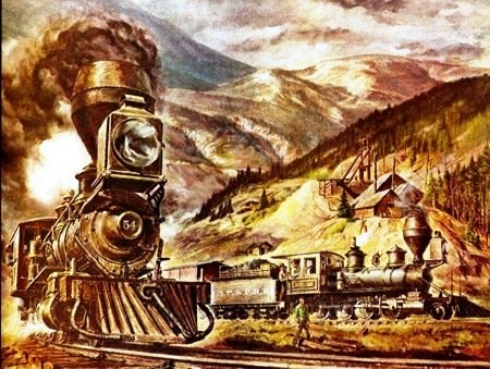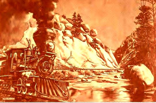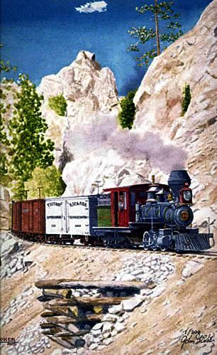 This page portrays artwork and memorabilia that displays some aspect of the South Park Line in glorious colour. Some are based on black and white photographs with a little artistic license. Others are less realistic but give an impression of the 1878 to 1889 era. A number of those illustrated here hang on my walls, as moted in the captions.