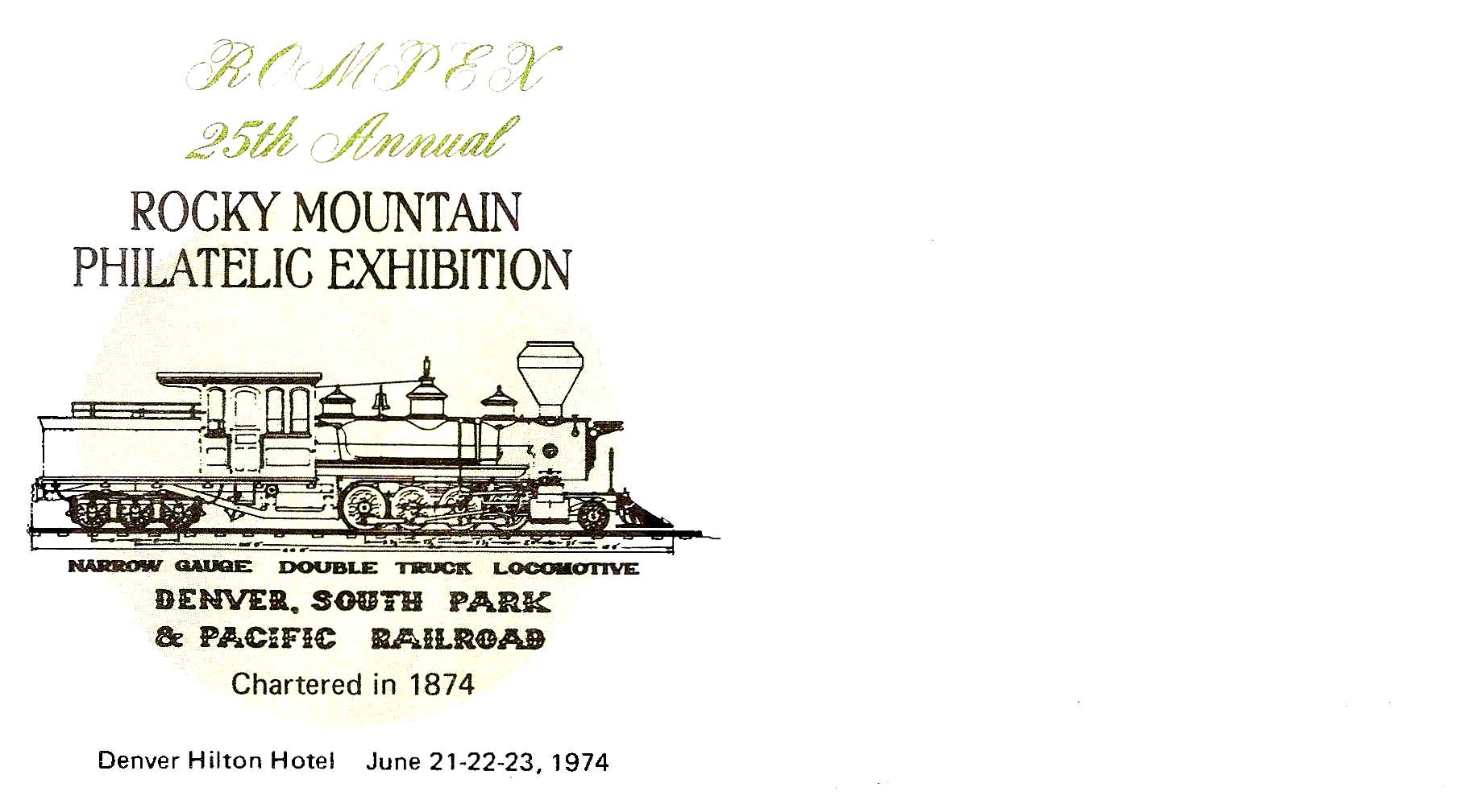 Unused cover 25th Annual Rocky Mountain Philatelic Exposiion (ROMPEX), Denver 1974,  commemorating 100th anniversary of Denver South Park and Pacific Railroad charter