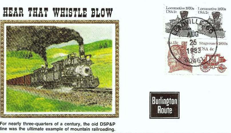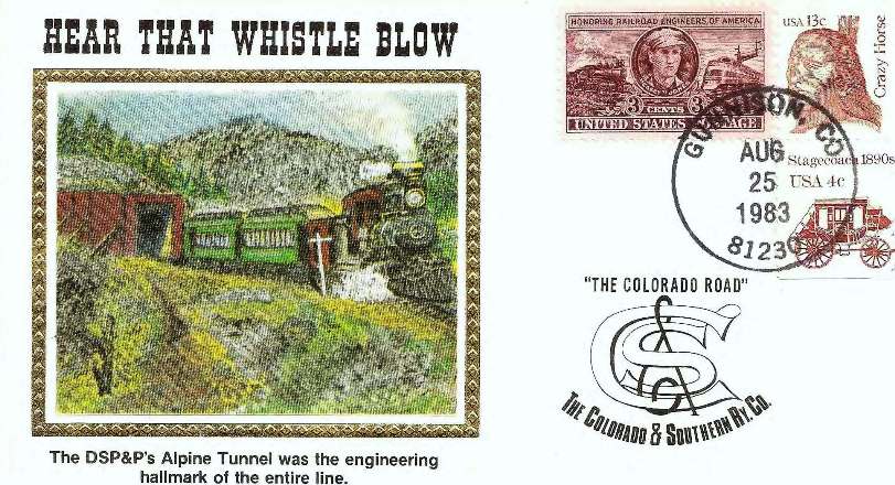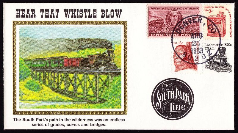 A commemorative postal cover postmarked 25 Aug 1983 at Gunnison CO with South Park logo, issued by Ferro-Phile, depicting a DSP&P passenger train on a trestle, limited edition #357 of 500 signed on reverse by the artist. Stamps include a 3 cent of 1950 honouring railroad engineers, a 13 cent honouring Crazy Horse, and a 4 cent illustrating a stage coach of the 1890's, both issued in 1982.