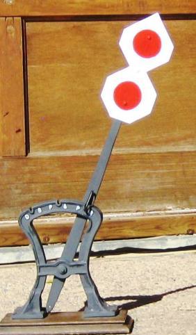Haro style sqitch stand: One-sixth scale model has 3 slots on the top edge of the harp to position the lever arm, which is locked in place with a key placed in the slot. Created by Ralph's Railroad, Denver CO.==>