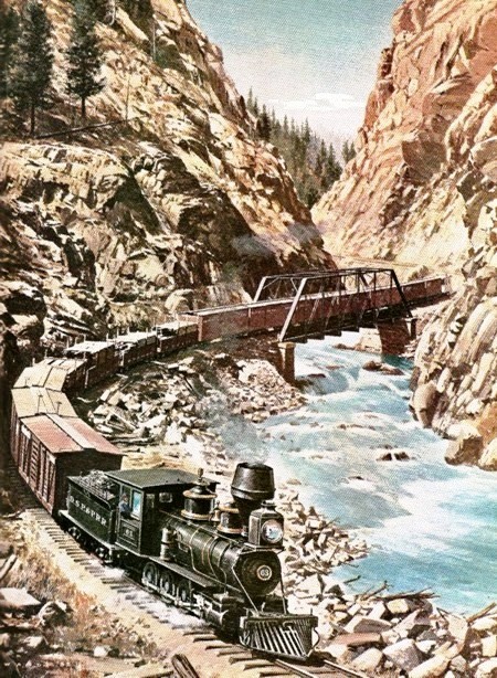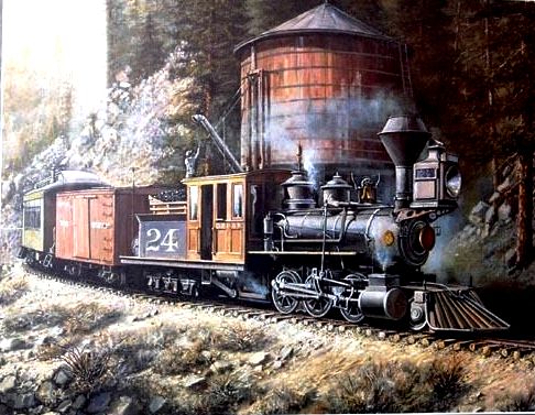 A series of art prints in "The American Eye of Evelyn Curro" appeared in 1972 and included this rendering of DSP&P #15 in red  with russia Iron boiler. Its bright red colour scheme was probably not authentic, but made for dramatic art.  This image may have been the inspiration for the 1983 Delton colour scheme shown below,