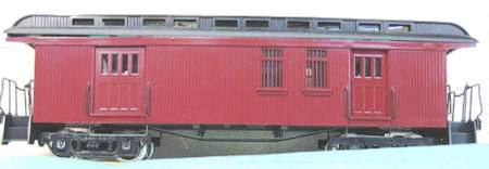 DSP&P baggage-mail-express car #42, built by DSP&P in 1879, originally had a single baggage door, centered on the car, end platforms, and probably with the broken duckbill contour similar to other cars built b