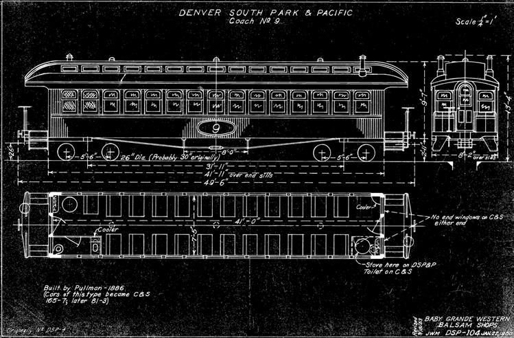 This plan by John Maxwell shows DSP&P #9 as delivered with large number plaque. He notes that the car was built by Pullman in 1886; other sources say 1879 at DSP&P shops, but possibly from a Pullman kit.