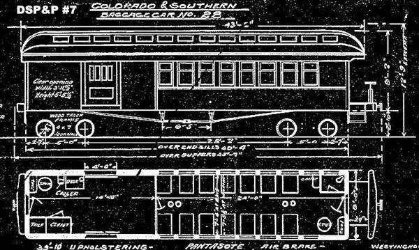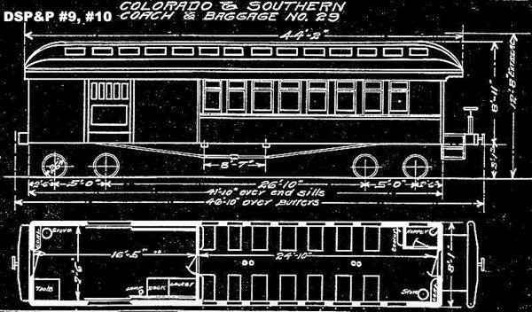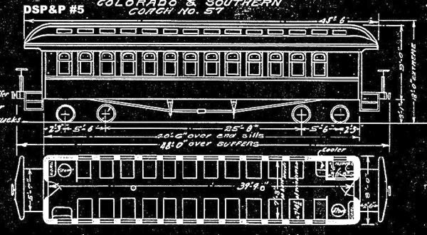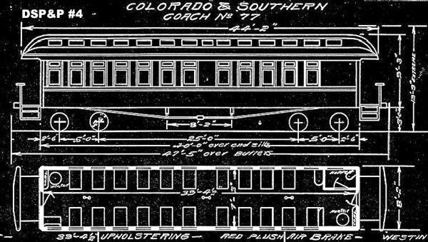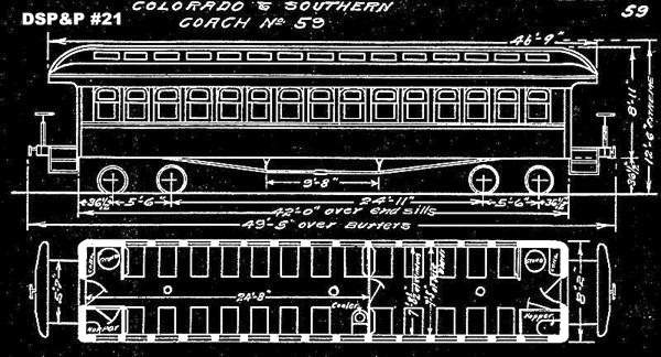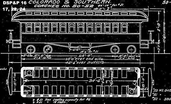 The first coach, DSP&P #2 "Denver" arrived in 1874 along with DSP&P #1 "Auraria", a combine. There are no photos of these in their early years, but combine #1 survived into the C&S era and a folio drawing shows it to be 34' 9" feet over the body end sills. There were 12 windows to a side with 11 rows of seats, probably 2+1 configuration.