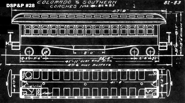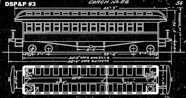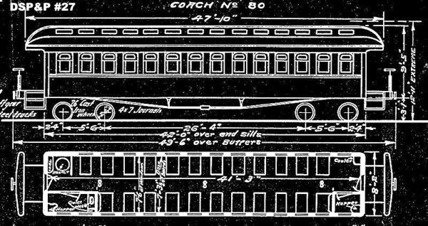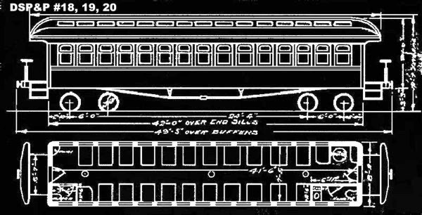 DSP&P's 23 coaches came from several sources across the first ten years of the railway's life. They ranged from 34 to 42 feet in length and most lasted well into the C&S era, with some rebuilds along the way. The variety of the window treatments are the most distinguishing characteristic of these cars. Roof lines varied but became uniformly bullnose style  sometime after delivery.