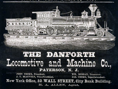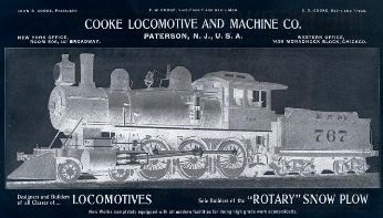 The Danforth & Cooke Locomotive Works, located in Paterson NJ, began operations in 1852. In spite of the 20-year head start that Rogers had, Danforth & Cooke grew very quickly. Orders for its locomotives were on the rise through the Civil War and into the 1880s. The Danforth & Cooke plant continued to operate even after it was merged into the American Locomotive Company in 1901, along with Rogers and 6 others , Under the control of Alco, it mainly built rotary snow plows or specialty engines for foreign companies. Danforth & Cooke's Paterson plant turned out its last locomotive in 1926 -- more than 3000 steam locomotives in all.