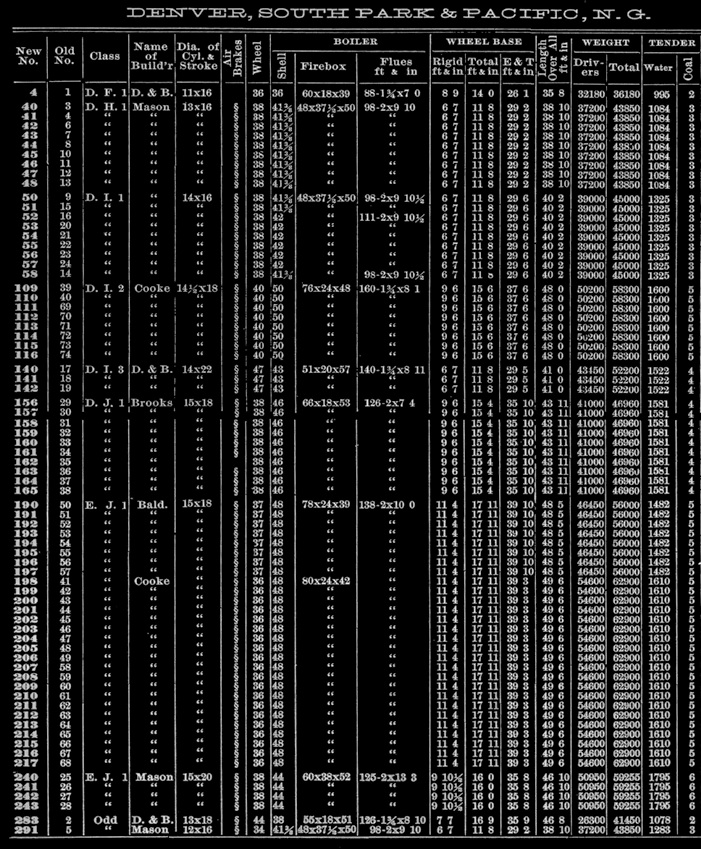 Extract from "Narrow Gauge Pictorial" Volumes VI. DSP&P locos scrapped before 1900 are not included.