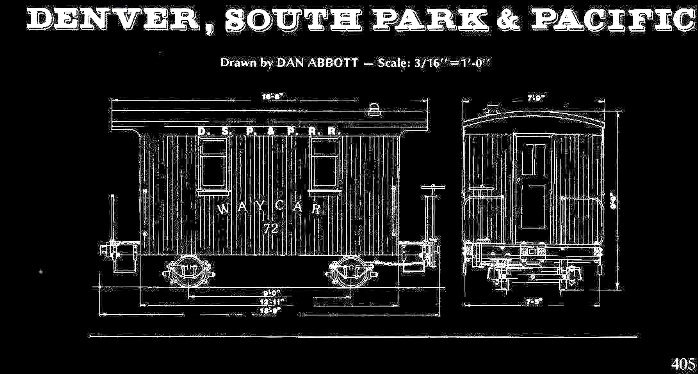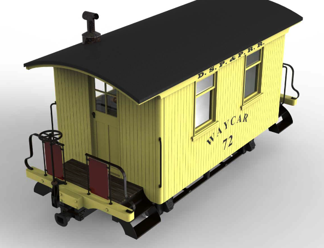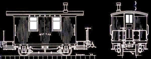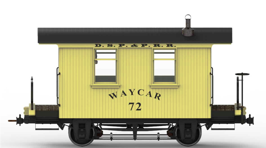 DSP&P waycars, or cabooses, were 4-wheel "bobbers" with a curved roof profile, no cupola, and two windows on each side. They could sleep two people but were mainly used for the conductor's office work. They were painted white with black lettering or oxide red with white lettering, apparently at random. Both colours can be seen on some trains. They varied in many details as they were built in small batches across a 5 year period. Length over the body varied between 12 and 13 feet with overall length over end platforms of 18 to 19 feet. Outside width was about 7'-9" with the platforms about 29" above the rails, and the roof about 7'-4" above that.