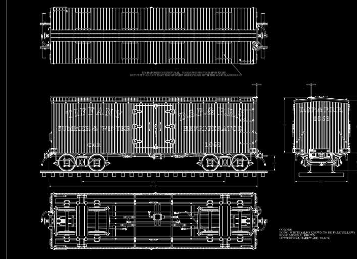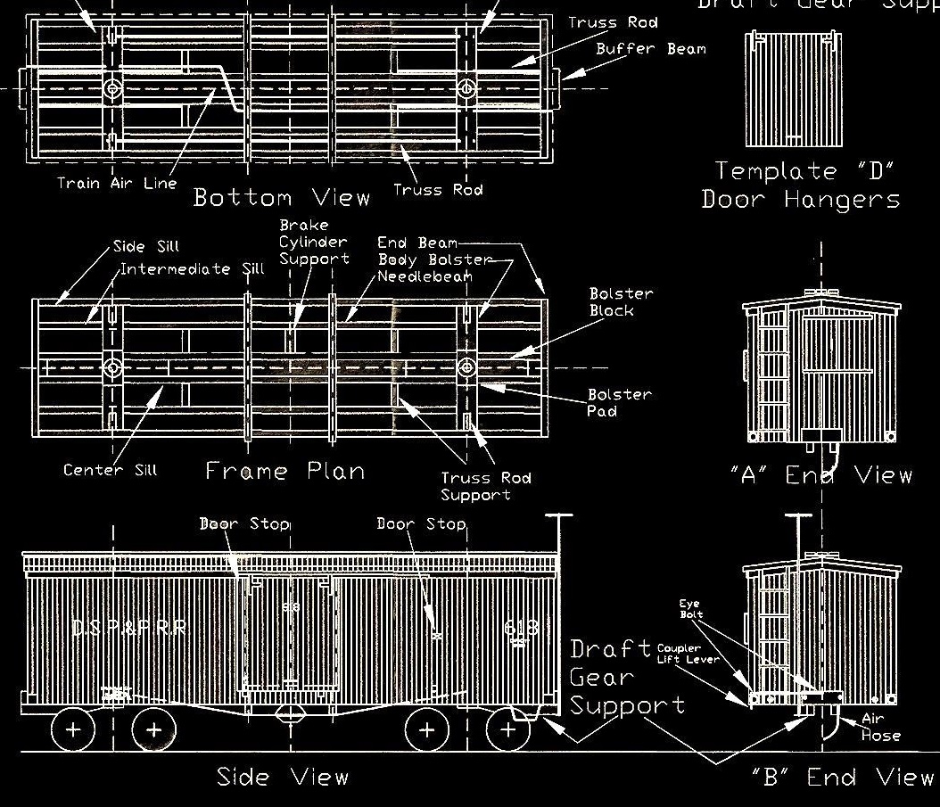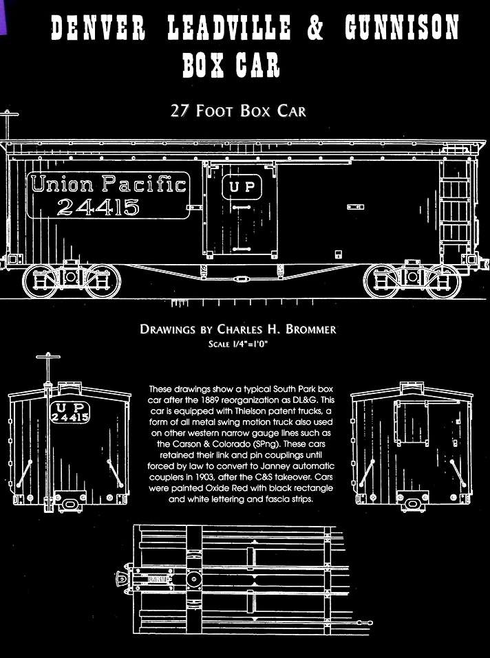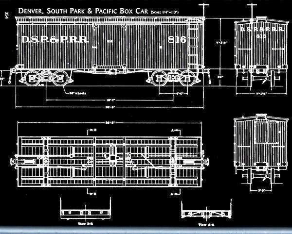 This page contains plans of Denver, South Park and Pacific Railroad freight cars that have been collected over many years from various publications. They are shown in reduced size to protect the original copyright, which remains with the artist, author, or publisher.