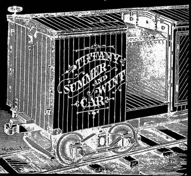 Note roof hatch and lift ring, interior cool air ducts, meat hooks on rail inside car,and end vent (1879).