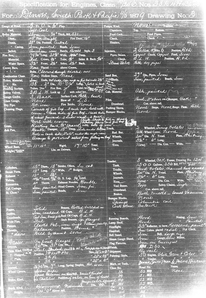 DSP&P Specification Sheet for 2-8-0 Locomotives 1879
