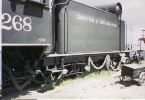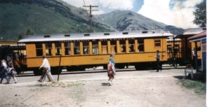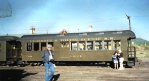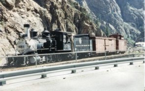 Sounds backwards, but this is the normal route for this part of the tour. Driving from Denver via Cañon City, visit the locomotive and passenger car on display at Alamosa. (I assume it is still there – my photos are from 1994).