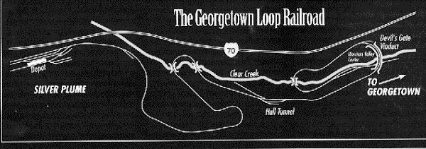 One of the busiest and one of the most interesting narrow gauge trips is the Georgetown Loop. Built as the Georgetown, Breckenridge and Leadville in 1882, headed to Leadville, it got a few miles past Silver Plume when the silver price crashed. It never went any farther. The rise from Georgetown to Silver Plume is nearly 600 feet in 2.1 miles, giving a 6% grade. This was not feasible so the railway made several loops over the valley to make the distance 4.5 miles and the grade only 2%.