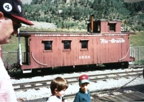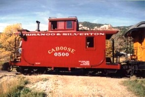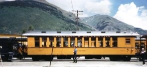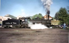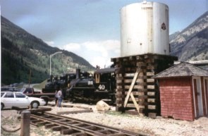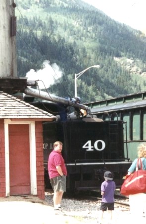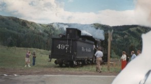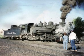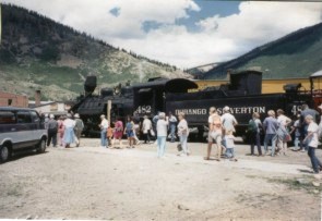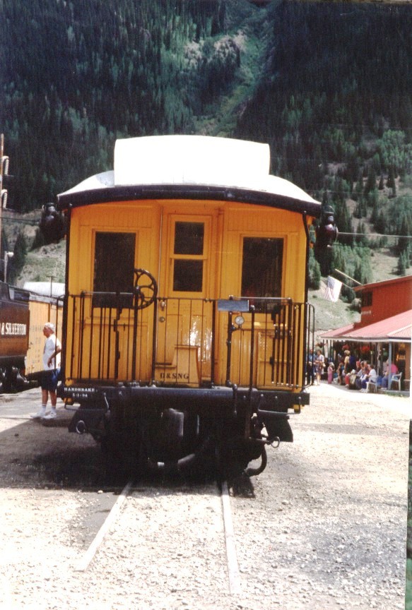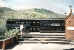 Durango has better shopping and a more attractive downtown. Special entertainment, for example, the Bar D Ranch chuckwagon supper and cowboy music, is easy to find. Our 2004 trip coincided with RailFest, so we saw the restored Eureka and Pallisades 4–4–0 at the Durango Depot. Goose #5 from Delores was also around but we didn’t see it. Photos below are mostly from 1994, a few from 2004.