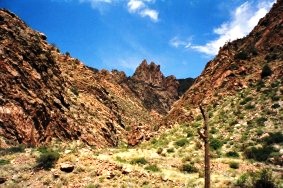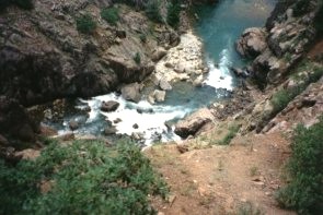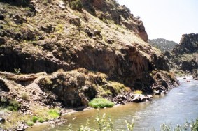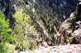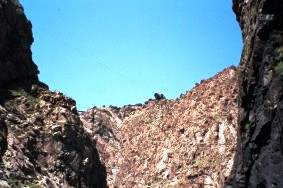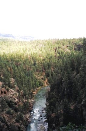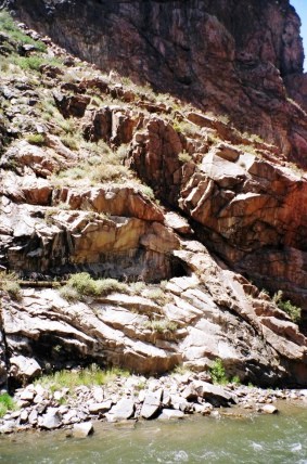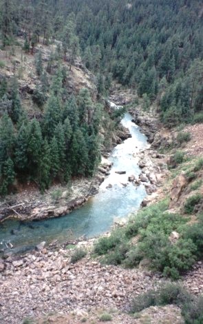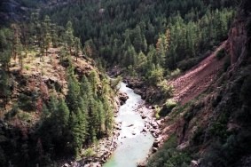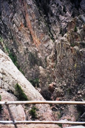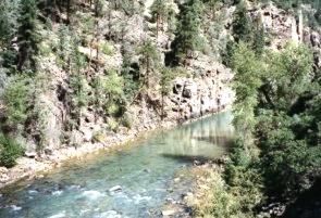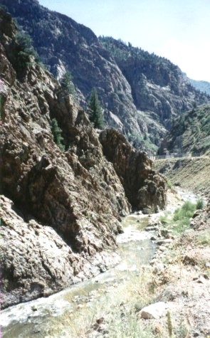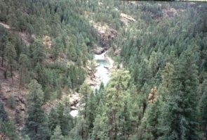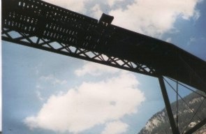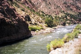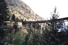 Here the canyon is 1000 feet deep with near vertical walls. The hanging bridge was built in 1878 by the Santa Fe and inherited by the D&RG in 1880 after the “Treaty of Boston” gave the route to the D&RG. It has been strengthened several times but retains its original design to this day. The route was washed out on numerous occasions over the years, even in recent times.