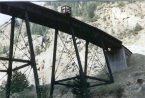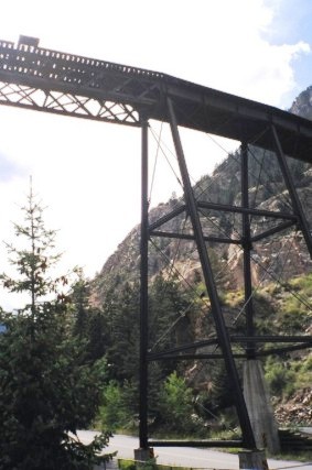 The major structure is the Devil’s Gate Viaduct, 300 feet long, 95 feet high, on a continuous sharp curve, and a 2% grade. Numerous smaller trestles allowed the track to make three and a half complete circles while ascending the grade. The first passenger train ran in 1884 and the last in 1939. The viaduct was scrapped during World War II.