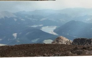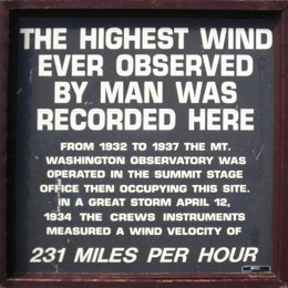 On a clear day you can see the mountains and valleys of New Hampshire, Maine and Vermont, north into Canada, and east to the Atlantic Ocean. There are, however, precious few clear days; fog and wind are more common. Mt Washington boasts the highest recorded wind speed measured on earth (231 mph) and the record low tempersture (-50 F) in the lower 48 states. Snowfall averages 311 inches (7.9 meters). Cairns and ropes mark the climbing and hiking trails.  Photos on this page by Sonja.