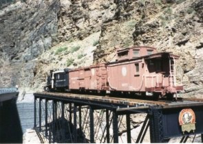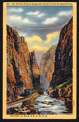 Originally part of the Denver and Rio Grande Railroad’s narrow gauge mainline from Pueblo westward to Salida, Leadville, and ultimately Salt Lake City, the Royal Gorge Route was the logo for D&RG advertising for years. It was converted to standard gauge in 1893 and is famous for its hanging bridge that allowed the track to follow the Arkansas River through the narrow 30 foot wide canyon.