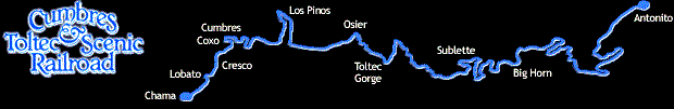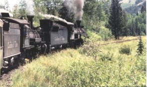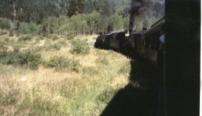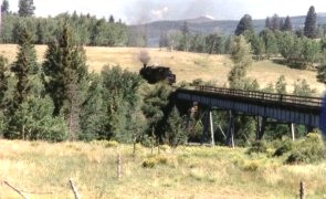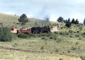 The trip on the Cumbres and Toltec route  can be divided into 3 parts: climbing the 4% grade to the summit of Cumbres Pass, the downhill glide on the 2% grade along Toltec Gorge, and the relatively flat romp across the lava prairie and aromatic sage brush to Antonito. The uphill climb features double-headed K-37’s, which have to split up temporarily to cross Lobato trestle. Sharp mule-shoe curves gain altitude by following side valleys to return 30 or 40 feet above the starting point. At Cumbres, the lead engine turns on the wye to return dead-head to Chama for another helper run.
