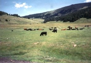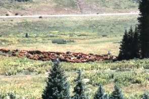After a healthy lunch at Osier dining hall, the train edges along Toltec Gorge and Rio de los Piños, some 400 feet below. Photos cannot give the full sense of depth seen by the naked eye. This portion of the route is sometimes called the “High Line”, but other railways used the term too. Rock Tunnel and Mud Tunnel (supported by wood lining) are shortcuts through headland that could not be circumnavigated. As the Gorge rises and the train drops into the valley, large herds of cattle are found grazing.