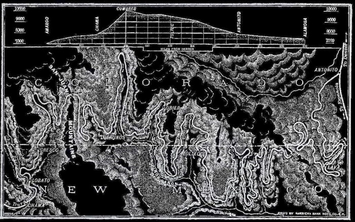 Chama was a major Division point for the Denver and Rio Grande Railroad’s San Juan Extension, built in 1880. From here tracks were laid to Farmington, NM and to Durango, CO and from there to Silverton, CO. The last San Juan Express ran in 1951 and the last freight in 1968. Oil field traffic to Farmington had kept the line alive long after the original mining activity had died out.