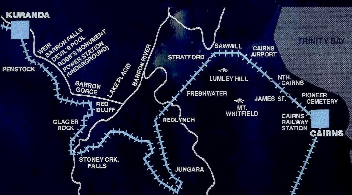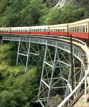 Purple and cream coaches pulled by diesel power carry a large audience over the spectacular eastern coastline of northern Queensland. Numerous spindly bridges, short tunnels, water falls, and tropical rain forest keep the camera clicking.