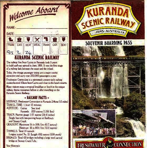 There is now a cable car, known as the Kuranda Skyrail, to view the rain forest from above, not present in 1993 during my visit. Locomotives are more modern today and carriages boast LCD television screens pointing out the scenic wonders visible from the windows. A short side trip to the aboriginal theater and art gallery at Kuranda are must-see cultural attractions.