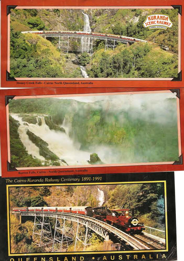 Postcards -- Stoney Creek Falls with diesel train (top), Barron Falls (middle), Stoney Creek again with steam locomotive on the point (bottom)