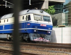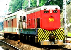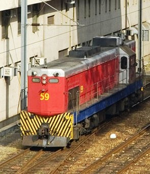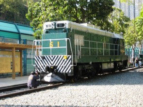 The KCR train was hauled by n GE-EMD G-12 or G-16 Diesel locomotive. They had 6 wheel trucks to keep the load on the light rails to a minimum. The G-12's had 1250 hp, arrived in 1954 - 56, and were numbered 51 - 55 (built under license in Australia). The G-16's with 1650 hp were #56 - 59 and arrived in 1960 - 64  (3 built in Illinois and the last one in Australia). G-12 #51 is preserved at the Hong Kong Railway Museum at Tai Po. G-16's #56 - 59 were still running in early 2008 with the KCR logo, usually switching or hauling mail cars to the International Mail Center as "extras". They appear to have been retired in 2008 - we did not see them on our 2009 trip.