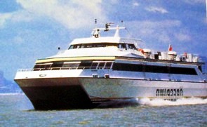 The Boeing 929 - 100 Jetfoil hydrofoil ferries are 90 feet long with a beam of 31 feet carrying 190 passengers in very comfortable seats. They can travel 50 miles per hour using two 3300 horsepower gas turbines driving 2 mixed axial flow, 24,000 gallons/minute Rockwell Rocketdyne Powerjet 20's. The ship burns 430 US gallons of fuel per hour, getting about 0.1 miles per gallon. The hydrofoils lift the ship's hull out of the water giving a very smooth ride even in a large swell.