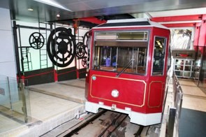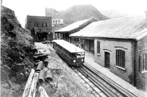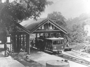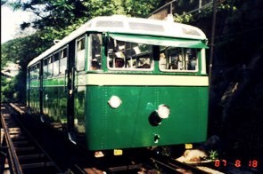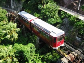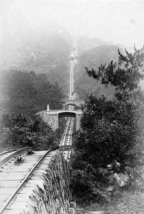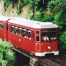 The Peak Tram dates back to 1888 when it used a coal fired boiler to run a steam driven cable to operate two funicular cars. The upbound car is balanced by the downbound car, thus little real power is needed. It runs on a single track with a passing siding at the halfway point. Today it is electric and the two two-car trains carry 120 passengers each way.