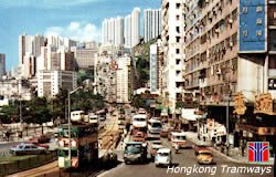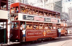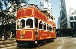 The streetcar makes a long 13 km east west run through downtown Hong Kong and returns on double track. A complete round trip on the Kennedy Town - Shau Kei Wan route will take 2 hours 20 minutes, so it's a great way to see the new and the old close-up. There are 163 cars available for service, running six different variations of the downtown route. All were built and refurbished by the railway shops.